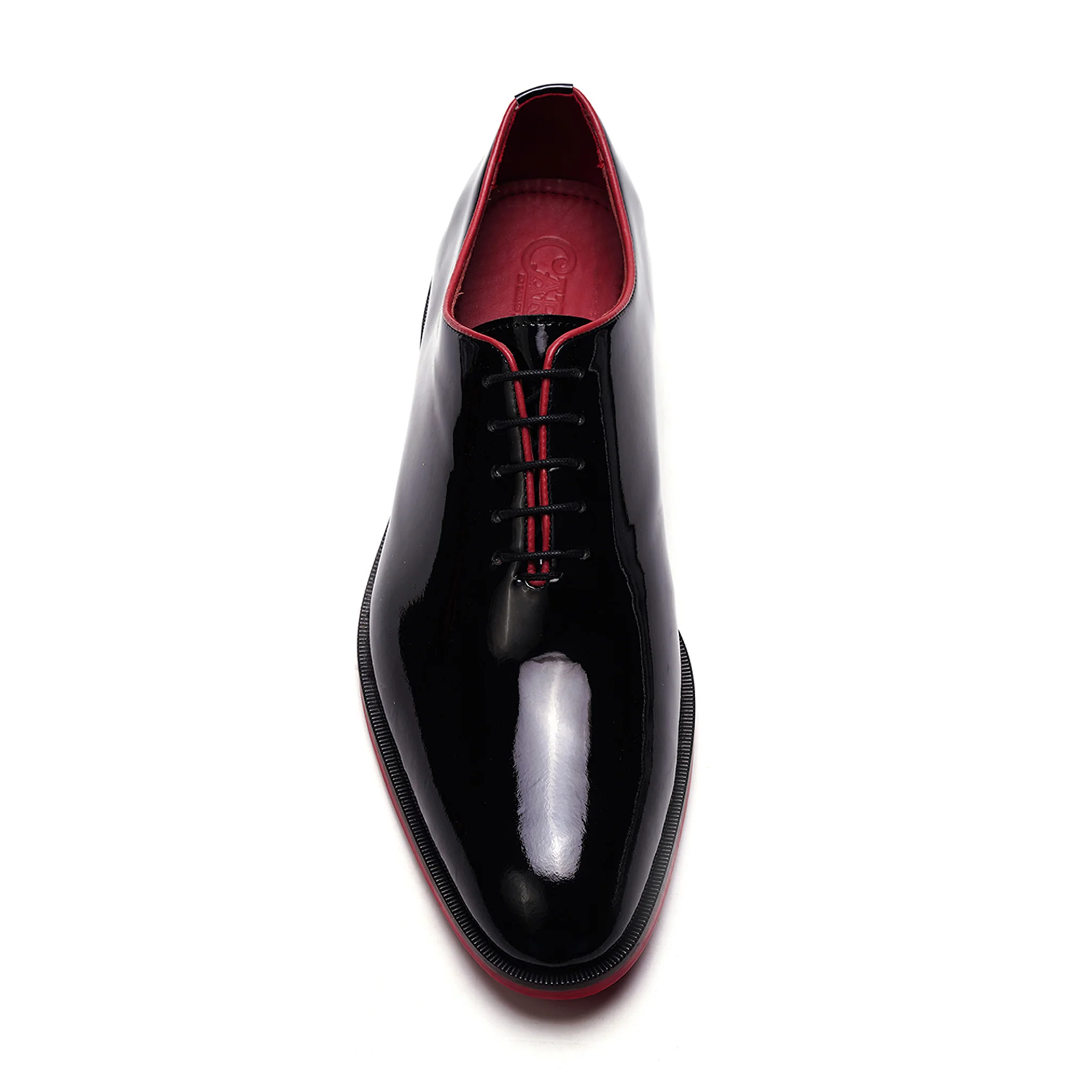 The SINCLAIR Wholecut Oxford epitomizes sleek sophistication, crafted from glossy patent leather with striking red accents. A vibrant red rubber outsole featuring signature Carlos guitar embossing complements its luxurious style, while Ortholite cushioning ensures superior comfort.